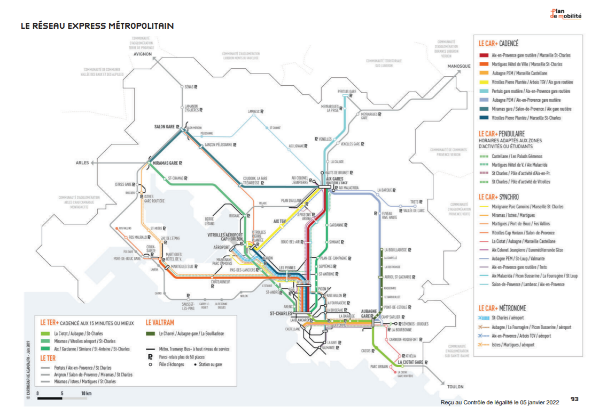 Un réseau express métropolitain train et car. La Métropole souhaite développer ses services ferroviaires avec notamment trois lignes « TER+ », sur les trois principaux axes empruntés : Marseille-Aix ; Marseille-Aubagne-Toulon et Marseille-Vitrolles-Miramas. Pour les autres axes, le réseau express métropolitain intègre 26 lignes de « lecar+ » avec 100 km de voies réservées au bus sur les portions stratégiques des voies rapides de la Métropole.